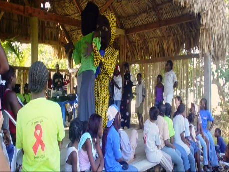3) community-based awareness programming that incorporates popular education and participatory theatre techniques - 12-foot (3.6 metre) puppet construction, presentations by community leaders/elders, collective story creation, song writing/drumming, performance, etc.