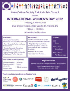"We are pleased to announce that Kulea Culture Society has partnered with the Victoria Arts Council for this year’s International Women’s Day celebration and live event, with a screening presented by CineVic Society of Independent Filmmakers. Who Is Your Shero? will include presentations by four community leaders, performances by four local artists, and five short films by local filmmakers."