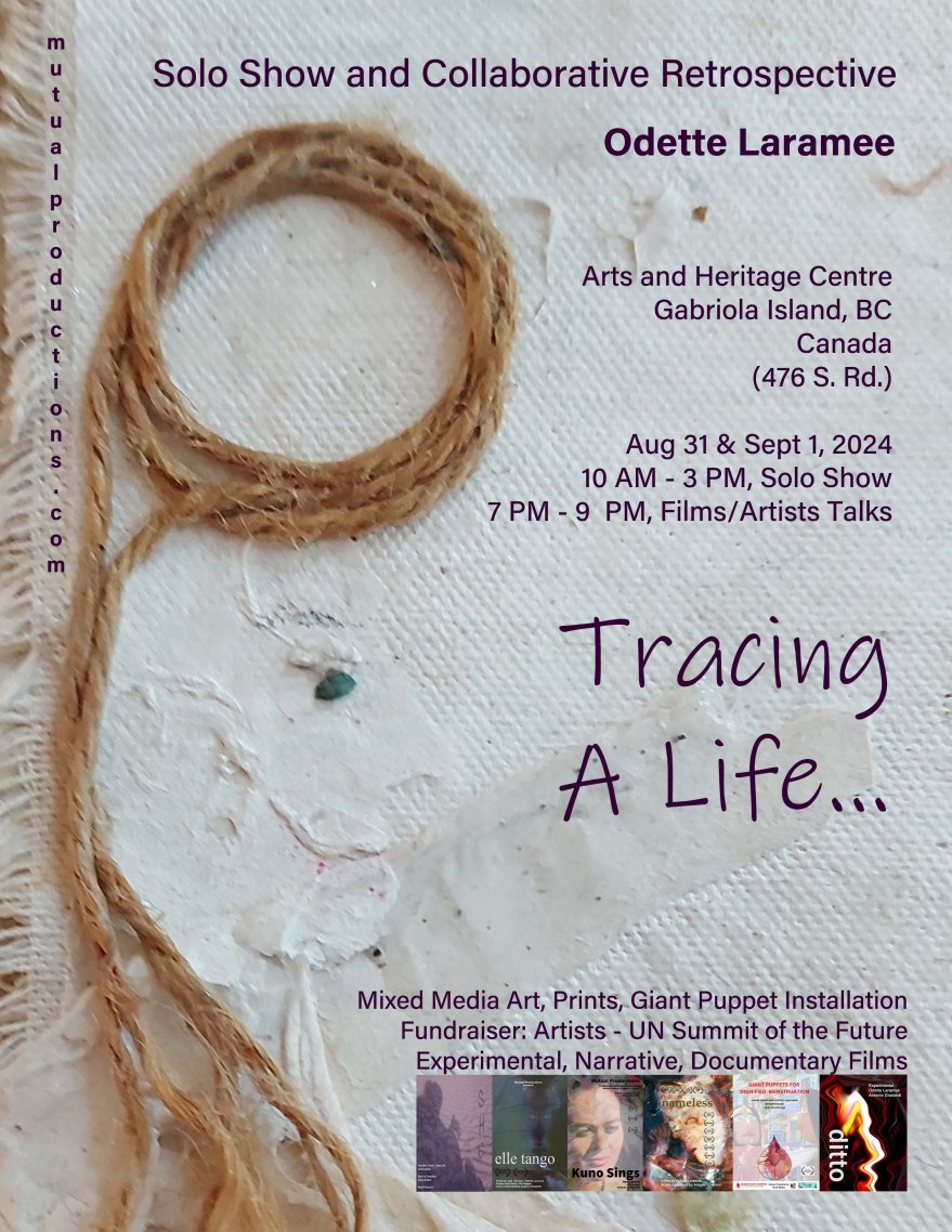Laramee says, “It is very meaningful to me to be preparing the ‘Tracing A Life …. Solo Show and Collaborative Retrospective’. I imagine the fun in sharing clips from ‘Swan Lake - A Twisted Telling’, the infamous giant-puppet show built on kayaks, performed by Jennifer Langley and myself. Also, the opportunity to offer a sneak preview of new work. Plus, presenting an invitation to community to support the upcoming international creative adventure ‘Artists Creating Change’, which will begin this September (2024) when I attend the United Nations - Summit of the Future as a member of the Arts & Culture ImPACT Coalition and Working Group.”