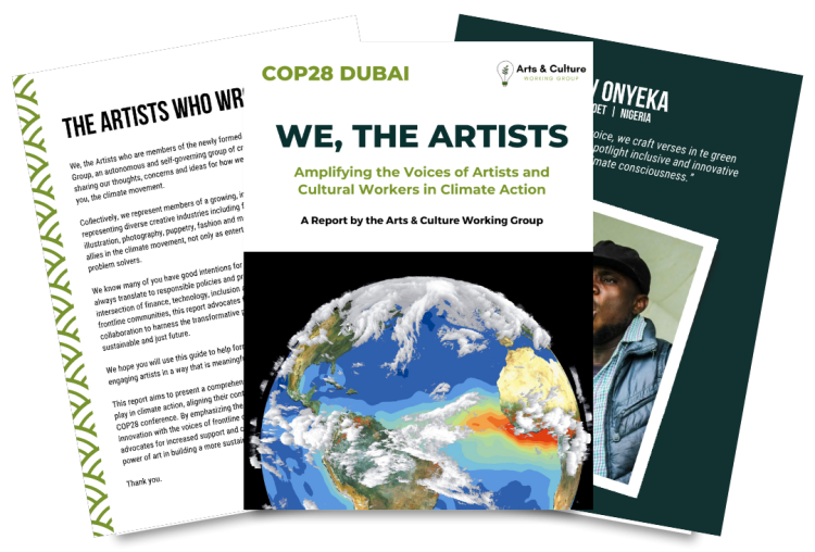Link: We the Artists COP28 Report https://d1yei2z3i6k35z.cloudfront.net/4385045/6575cd012b0e8_WetheArtistsReportforCOP28.pdf